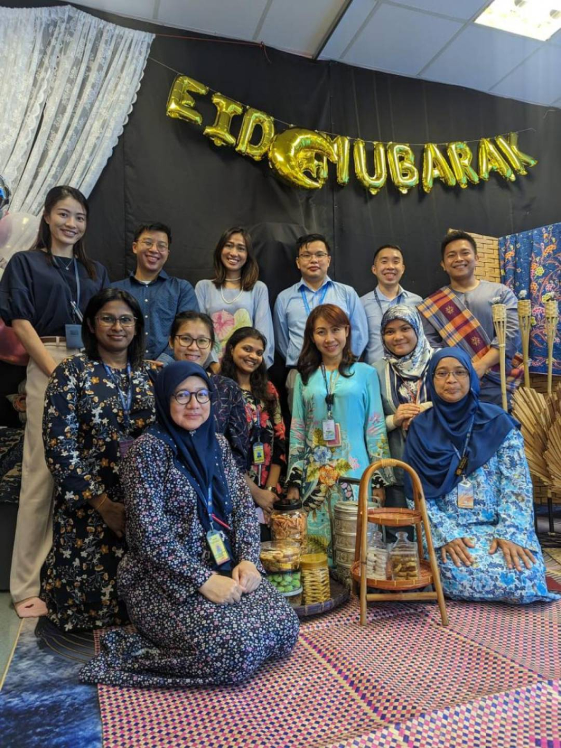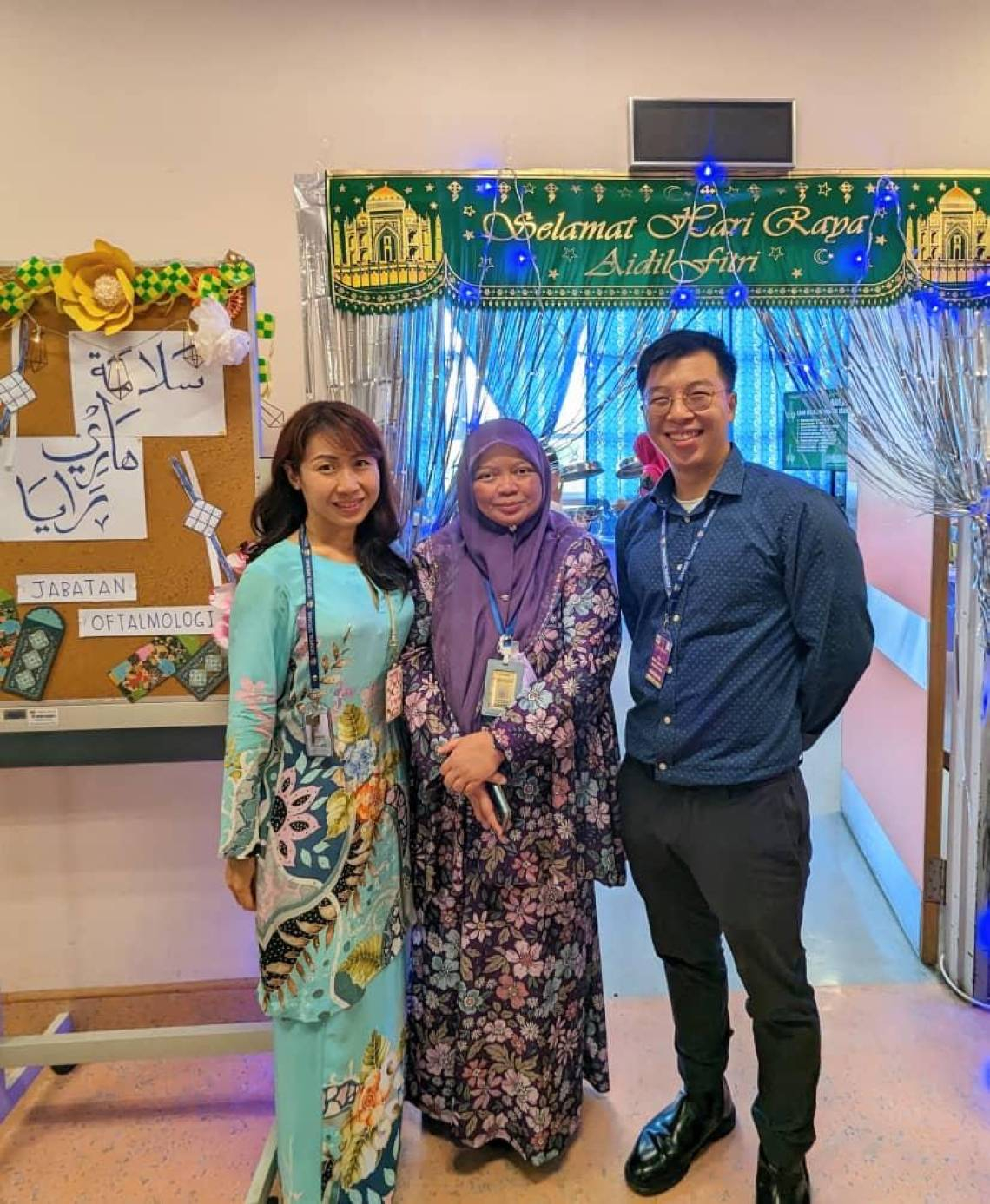 Allan joyfully marking Eid festivities with his Ophthalmology colleagues at Serdang Hospital.